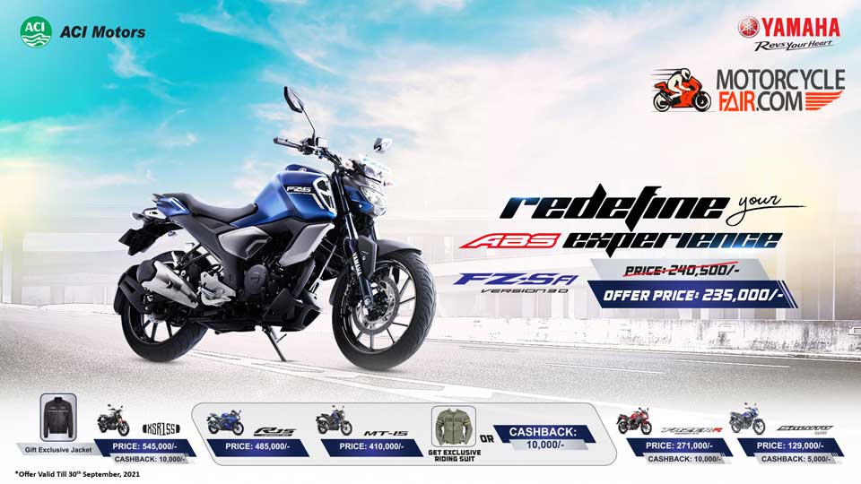 Redefine your ABS Experience with yamaha bikes in Bangladesh. Yamaha FZ-S Fi V3 ABS has a cashback Price of BDT 5,500/= In addition, there will be cashback offers on all motorcycles throughout the month of September 2021.